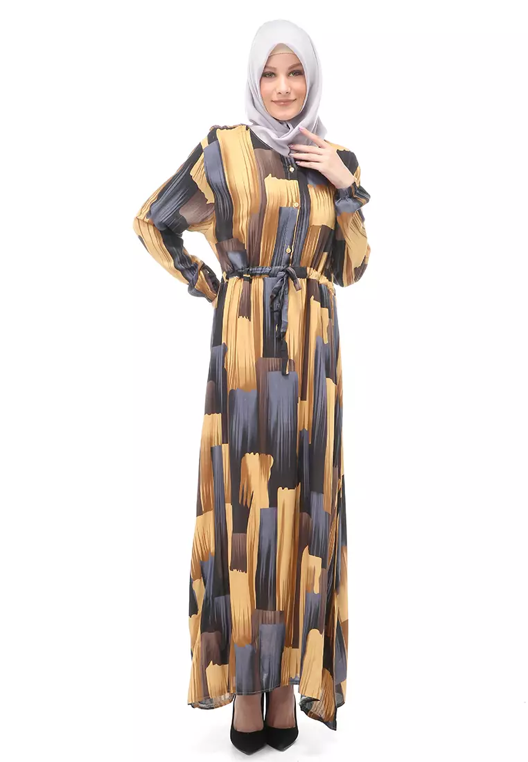 Monalisa Maxi Dress Muslimah Wanita Bermotif Corak Long Sleeve Regular Fit - Multicolor