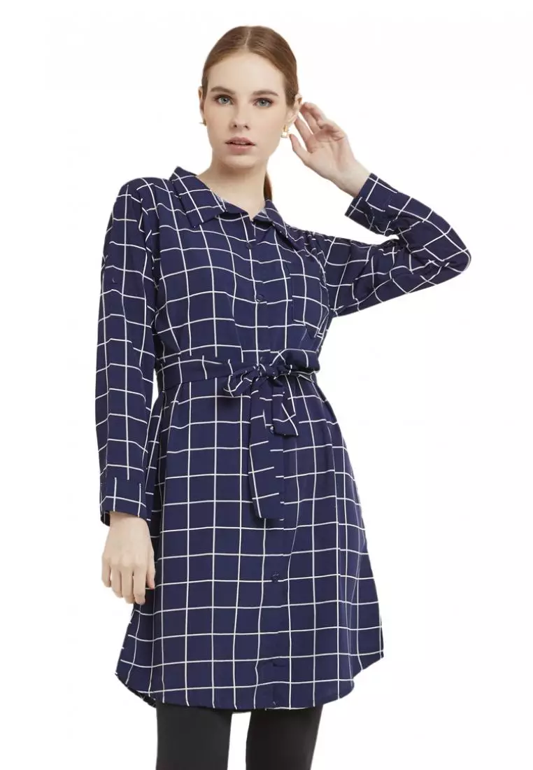 Tunik Square Lengan Panjang Baju Wanita Kotak-Kotak Regular Fit - Navy