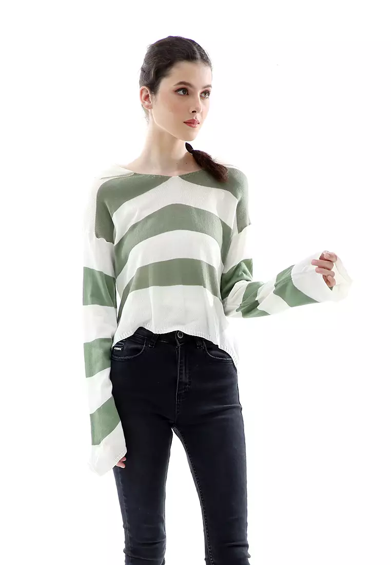 Vilia Rajut Crop Atasan Wanita Oversize Motif Stripe Garis Relaxed Fit - Mint