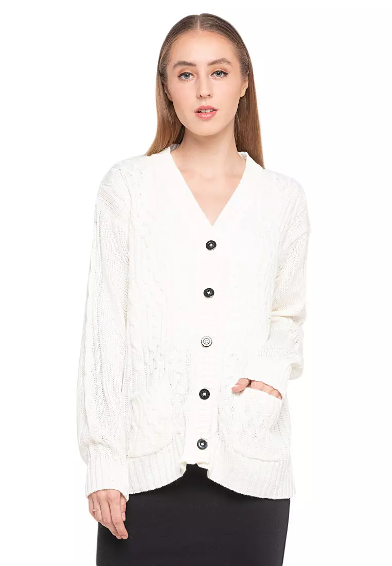 Winifred Kardigan Cable Atasan Wanita Long Sleeves Oversize Relaxed Fit - Off White