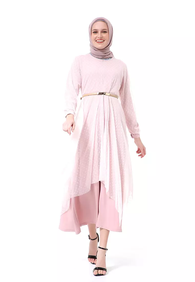 Zahwa Long Dress Gamis Muslimah Long Sleeve Free Belt High Quality - Pink