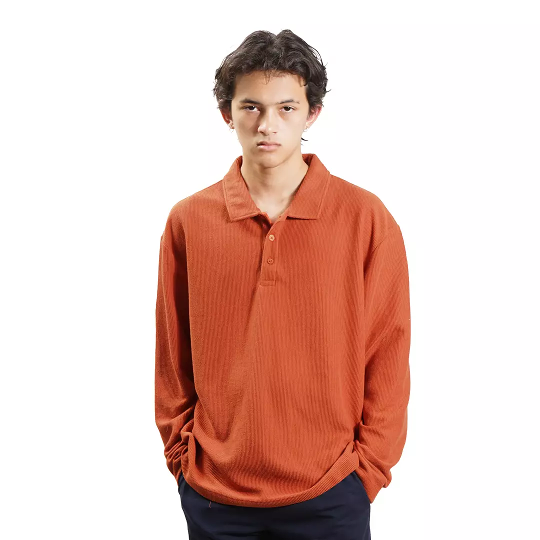 Vertical Texture Long Sleeve Polo Shirt Coral Red