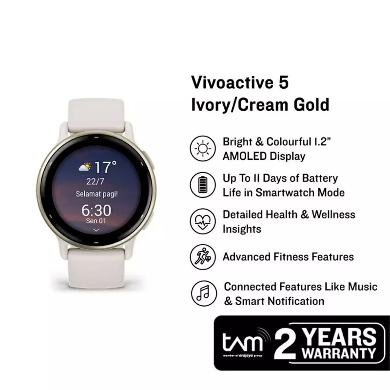 Jam Tangan Garmin Vivoactive 5 010-02862-5B Smartwatch Gold Alumunium Bezel Ivory Silicone Band