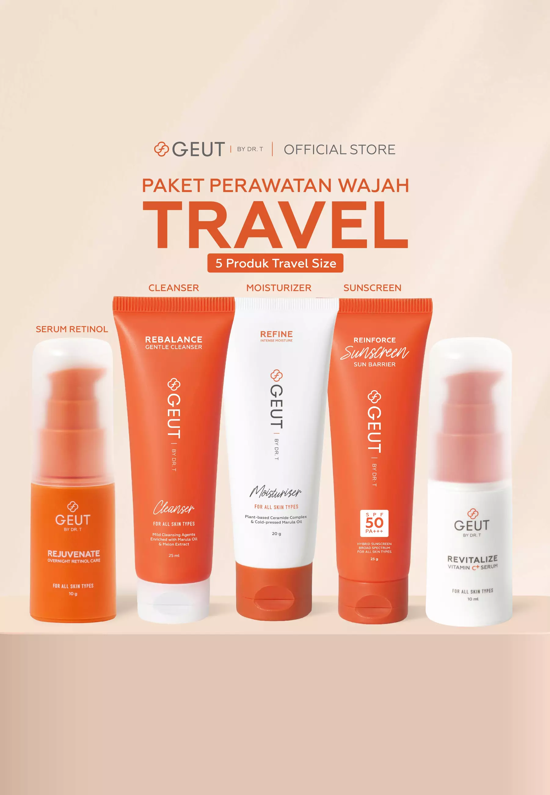 GEUT BY DR. TGEUT KISS Travel Set 5pcs (Paket Wajah Kulit Indah Sehat Seimbang Ukuran Travel, Cleanser + Moisturizer + Sunscreen + Serum Anti Aging)765000.00