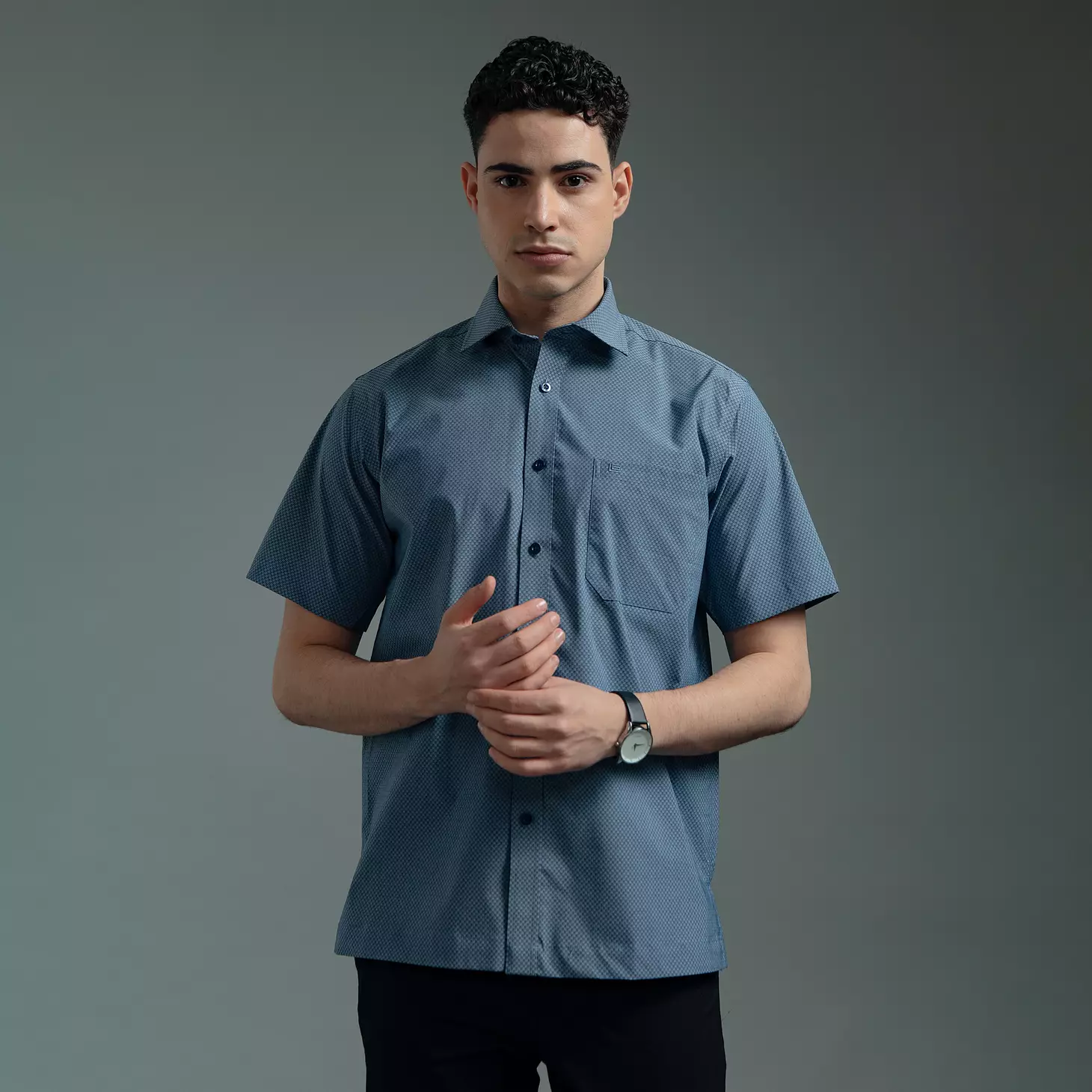 Kemeja Lengan Pendek Guy Laroche Mix Grid - Blue Cotton Mix Stretch Semi Formal