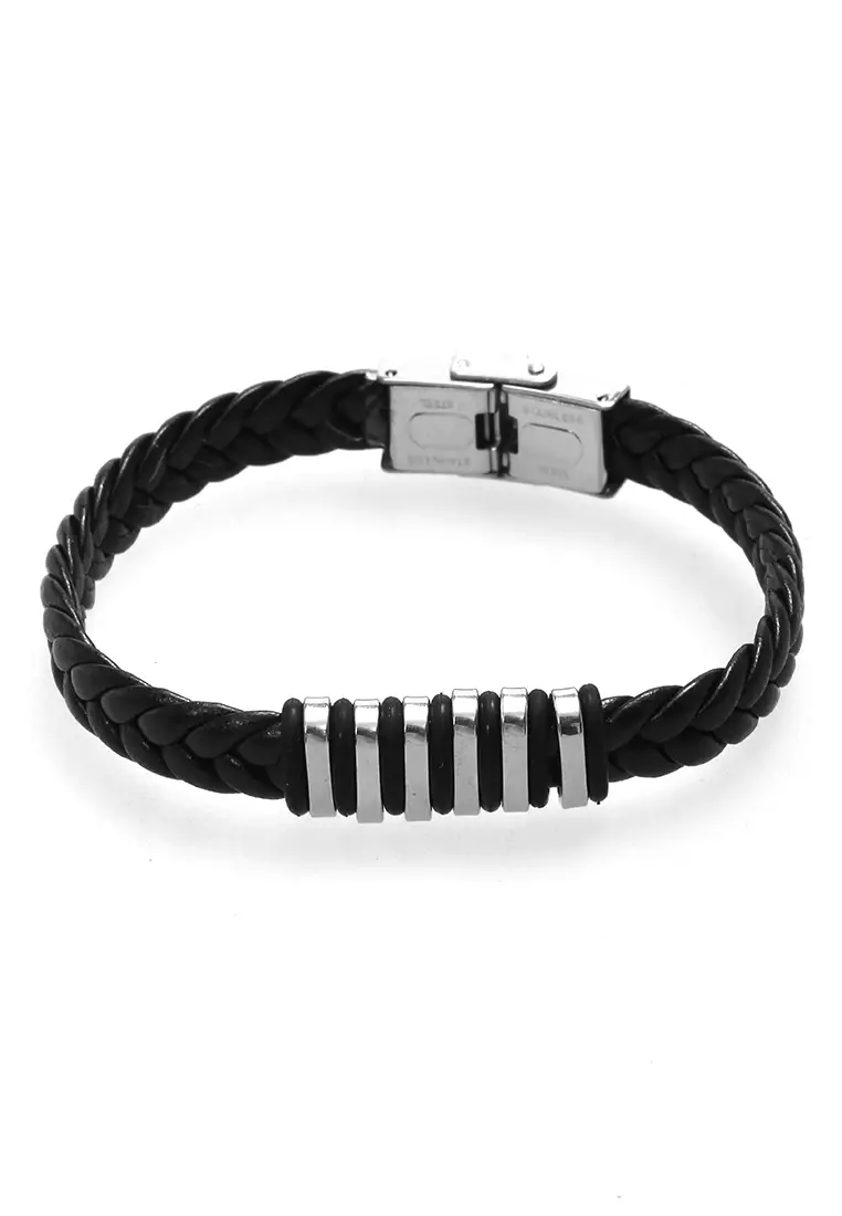 Aleda Gelang Kasual Pria Aksesoris Fashion Adjustable Strap Elegant Design Material Leather Stainless Steel ORIGINAL - Black Silver