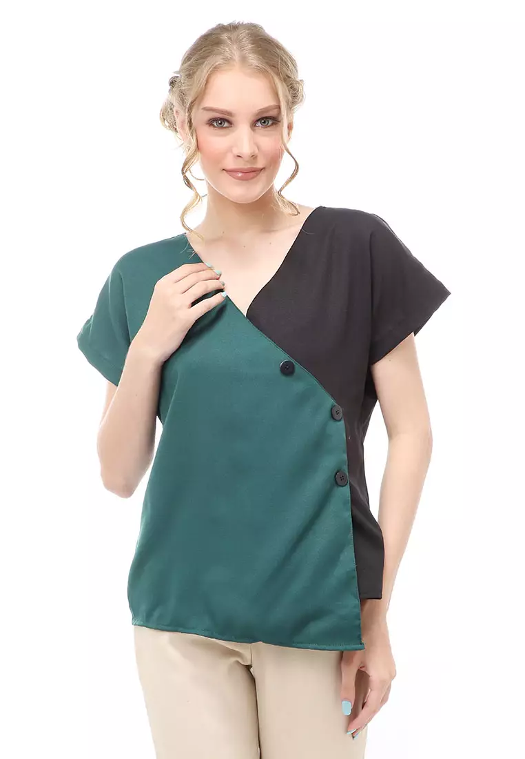 Cheva Blouse Atasan Wanita Kasual Model Asimetris Kombinasi 2 Warna Material Moscrepe ORIGINAL - Green