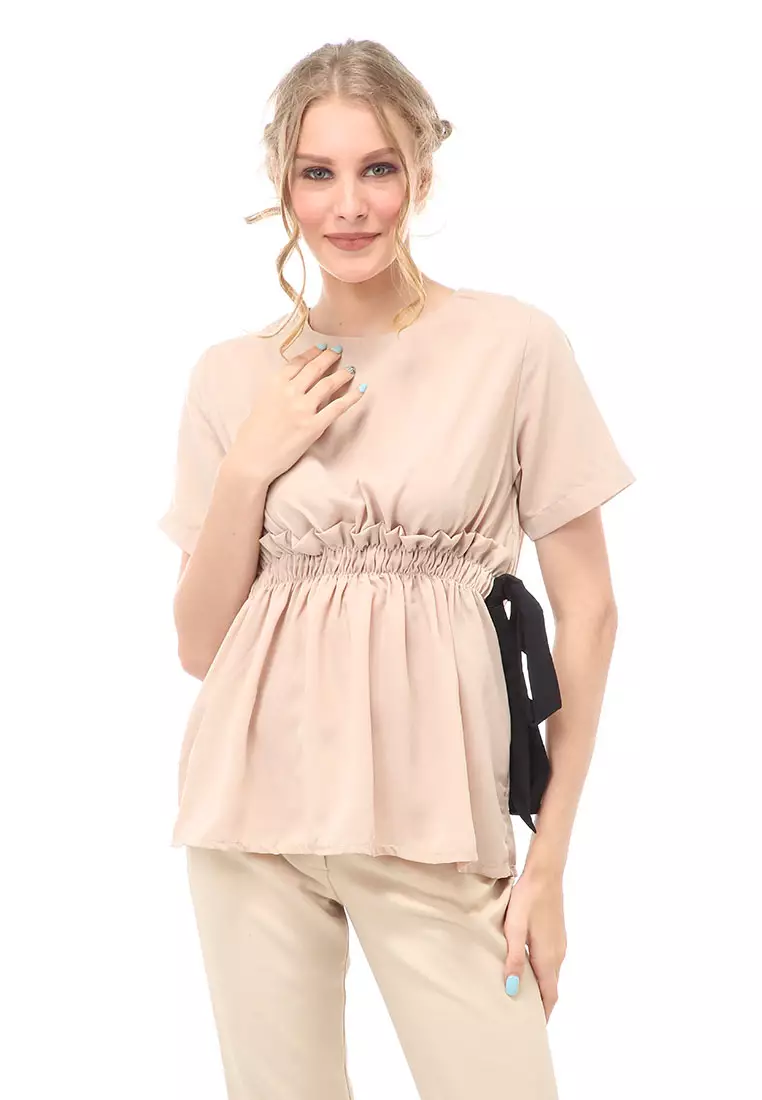 HamlinCheva Blouse Atasan Wanita Kasual Pinggang Karet Pita Ikat Simple Material Wolfis ORIGINAL - Cream1180000.00472000.00