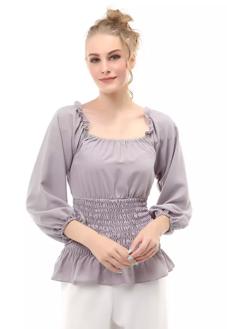 Cheva Blouse Atasan Wanita Sabrina Karet Pinggang Lengan Panjang Casual Shirt Long Sleeve Material Wolfis ORIGINAL - Gray