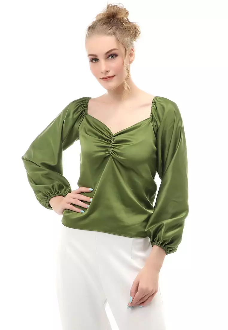 Cheva Blouse Casual Wanita Sabrina Kerut Dada Lengan Panjang Material Satin ORIGINAL - Army Green