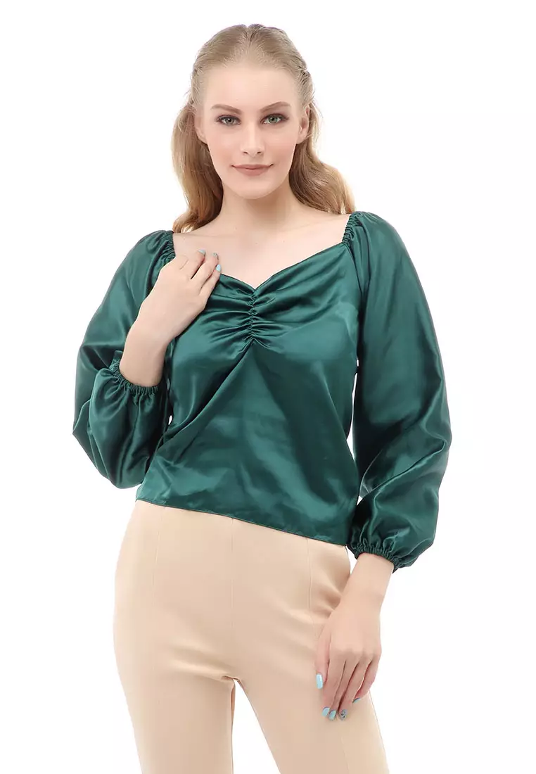 Cheva Blouse Casual Wanita Sabrina Kerut Dada Lengan Panjang Material Satin ORIGINAL - Green Bottle