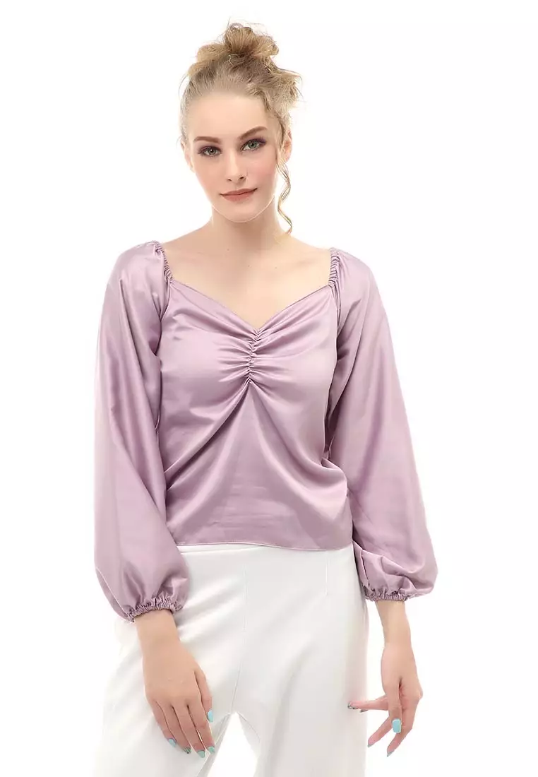 Cheva Blouse Casual Wanita Sabrina Kerut Dada Lengan Panjang Material Satin ORIGINAL - Lilac