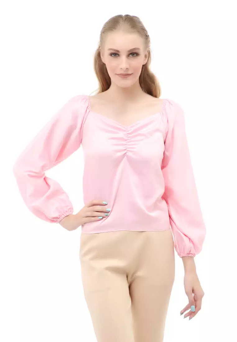 HamlinCheva Blouse Casual Wanita Sabrina Kerut Dada Lengan Panjang Material Satin ORIGINAL - Pink1450000.00580000.00