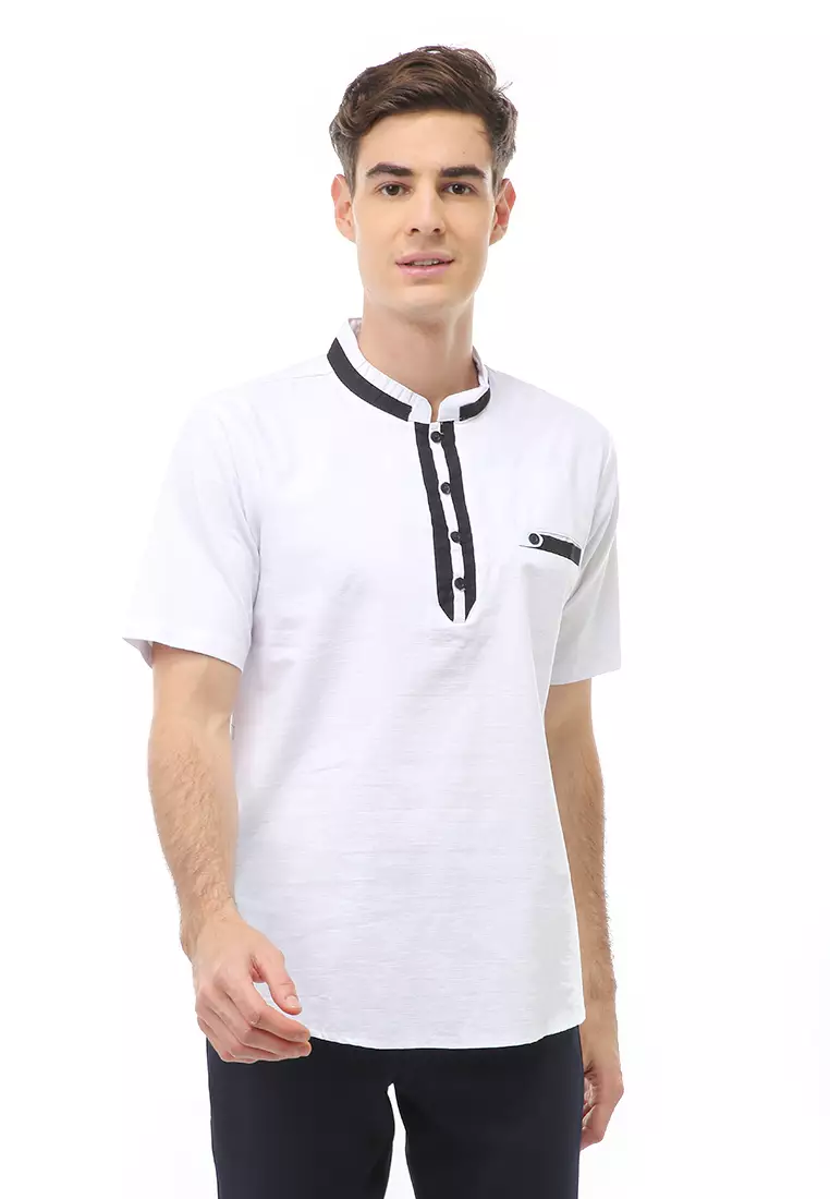 Dwan Atasan Formal Pria Kemeja Koko Motif List Kancing Short Sleeve Material Cotton ORIGINAL - White