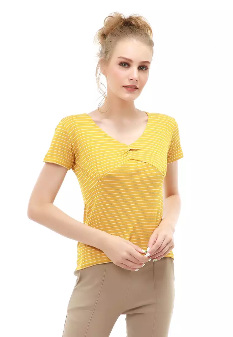 Genevie Blouse Kasual Wanita Lengan Pendek Model Salur Variasi Kerut Tengah Material Cotton ORIGINAL - Yellow