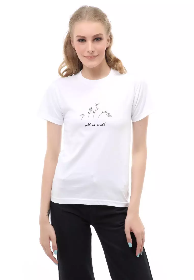Genevie T-Shirt Kaos Kasual Wanita All Is Well Short Sleeve Material Cotton Combed ORIGINAL - White