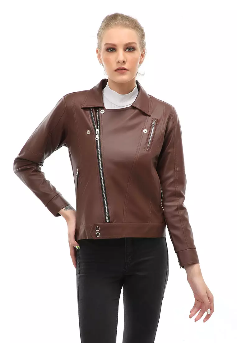 HamlinGlenice Jacket Outer Fashion Wanita Zipper Pocket Elegant Design Material Leather ORIGINAL - Brown3415000.001366000.00