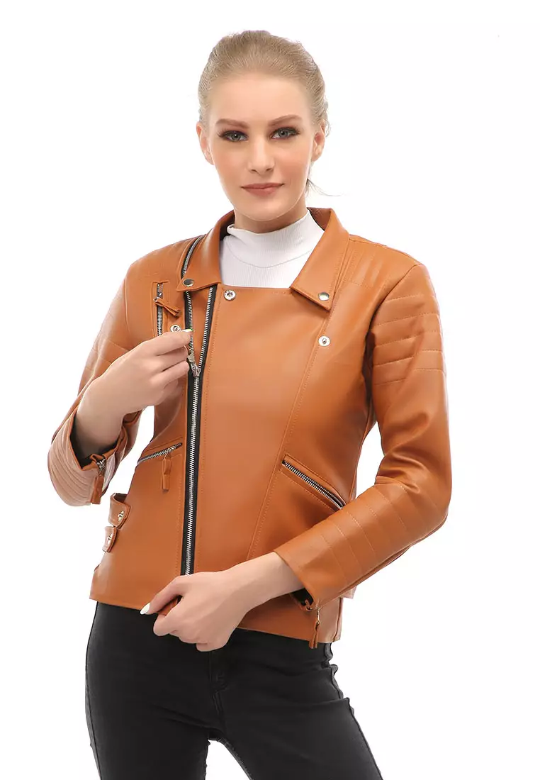 HamlinGlenice Jacket Outer Wanita Lengan Panjang Windproof Zipper Pocket Material Leather ORIGINAL - Tan3637500.001455000.00