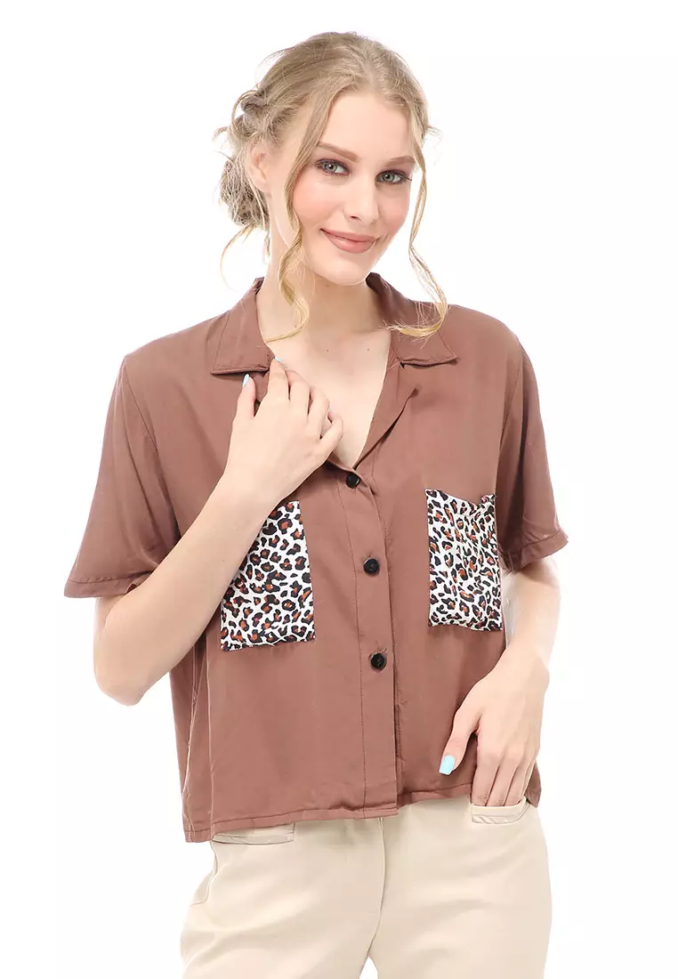 Holly Atasan Kasual Kemeja Wanita 2 Kantong Lengan Pendek Material Rayon ORIGINAL - Brown