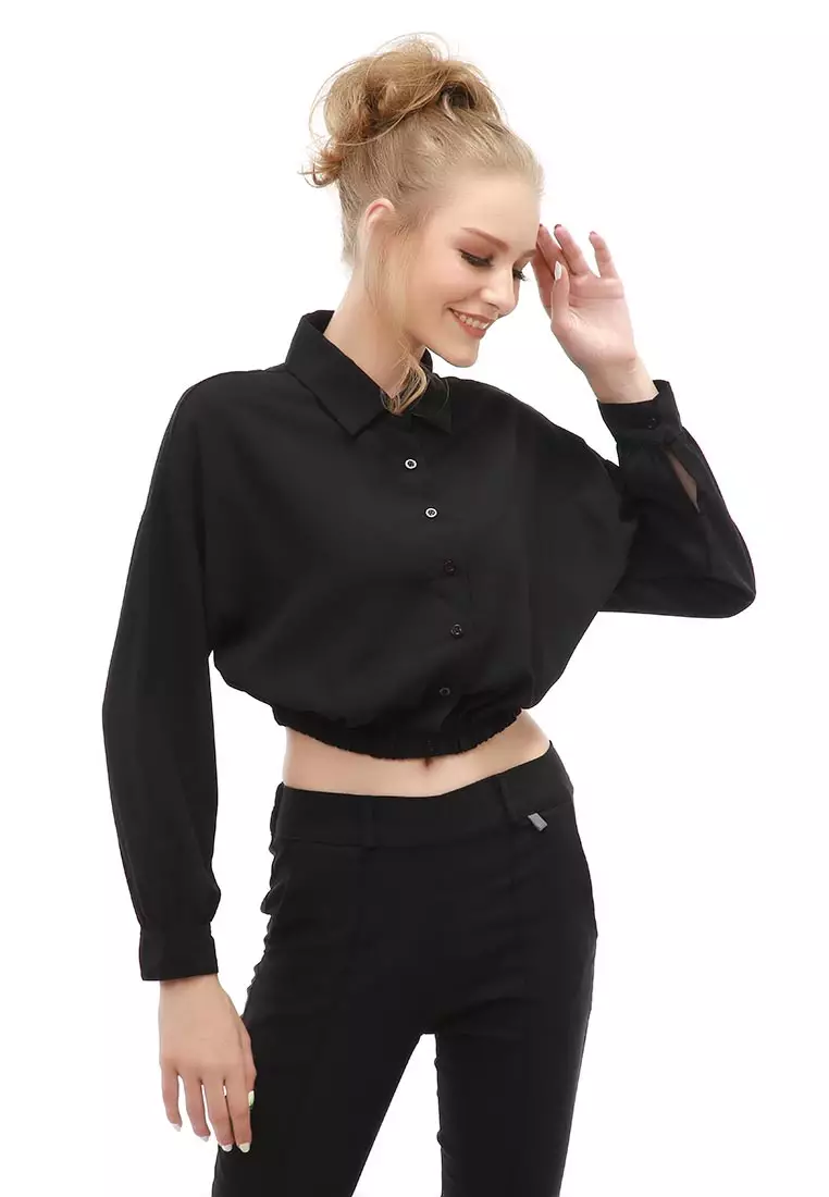 Holly Atasan Kasual Wanita Kemeja Lengan Panjang Shirt Long Sleeve Variasi Karet Pinggang Material Woven ORIGINAL - Black