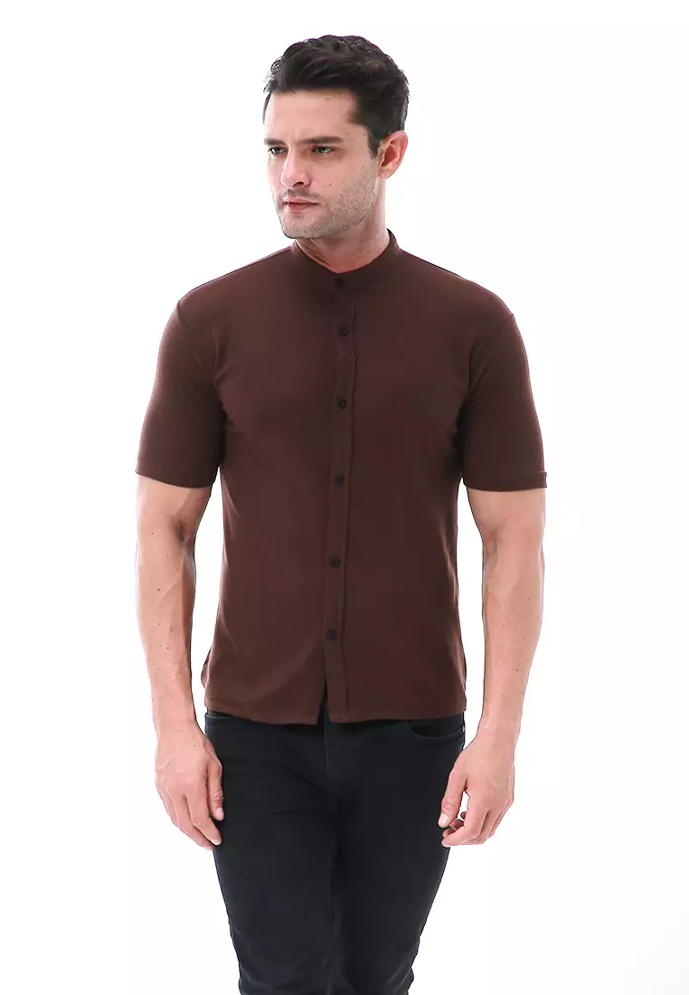 Leopold Atasan Pria Kemeja Kasual Slim Fit Lengan Pendek Motif Polos Material Cotton ORIGINAL - Brown