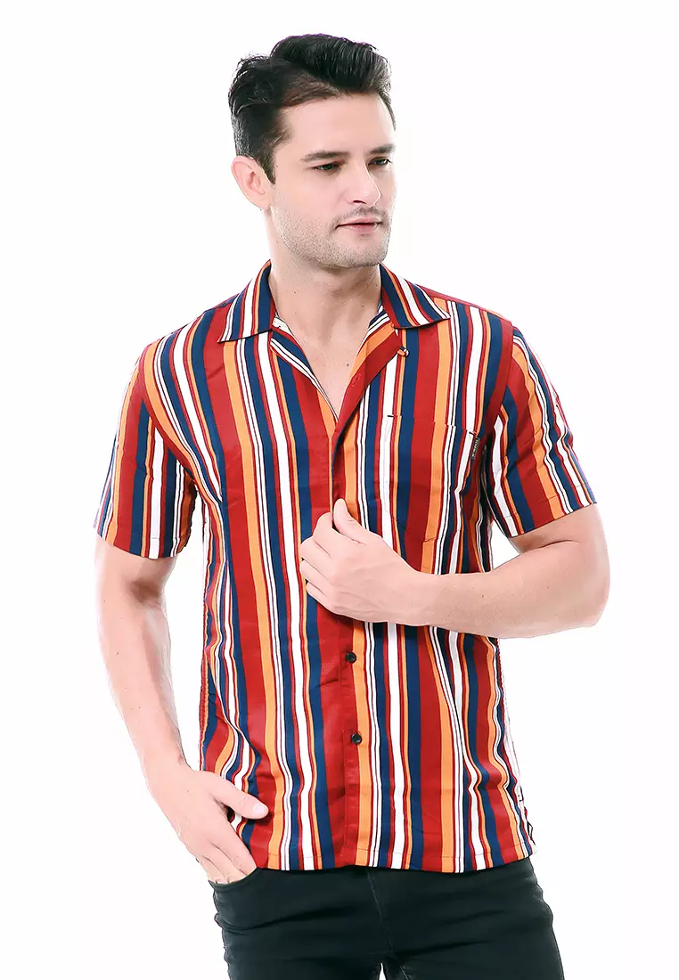 Leopold Atasan Pria Kemeja Motif Salur Lengan Pendek Material Cotton ORIGINAL - Maroon Yellow