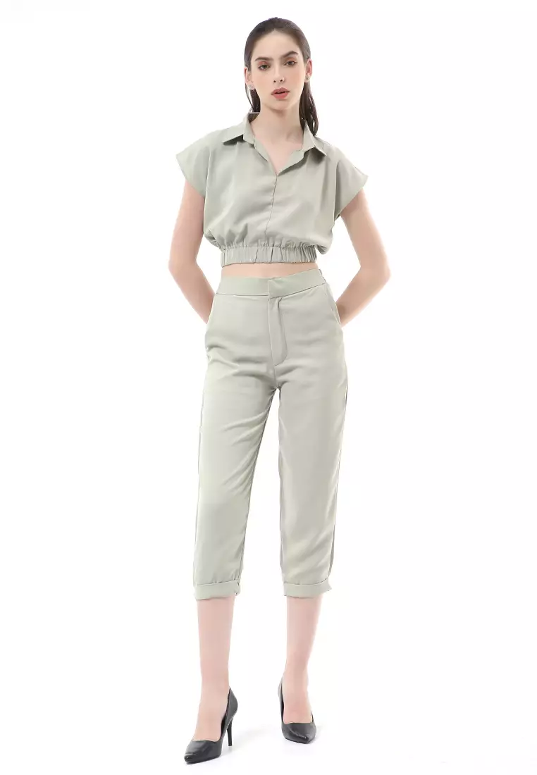 Nayra One Set Setelan Atasan Crop Karet Lengan Pendek Basic Pants Wanita Material Dolce ORIGINAL - Sage Green