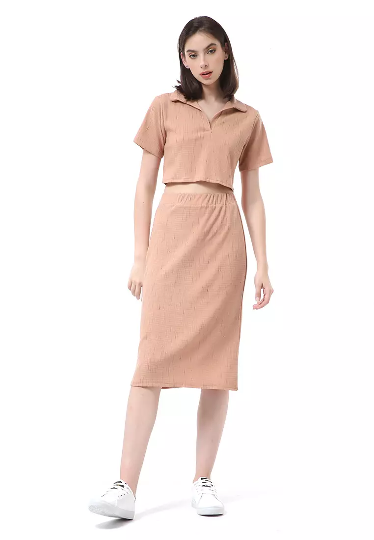 Nayra One Set Setelan Atasan Crop Lengan Pendek Rok Wanita Plain Motive Material Knit ORIGINAL - Chocolate