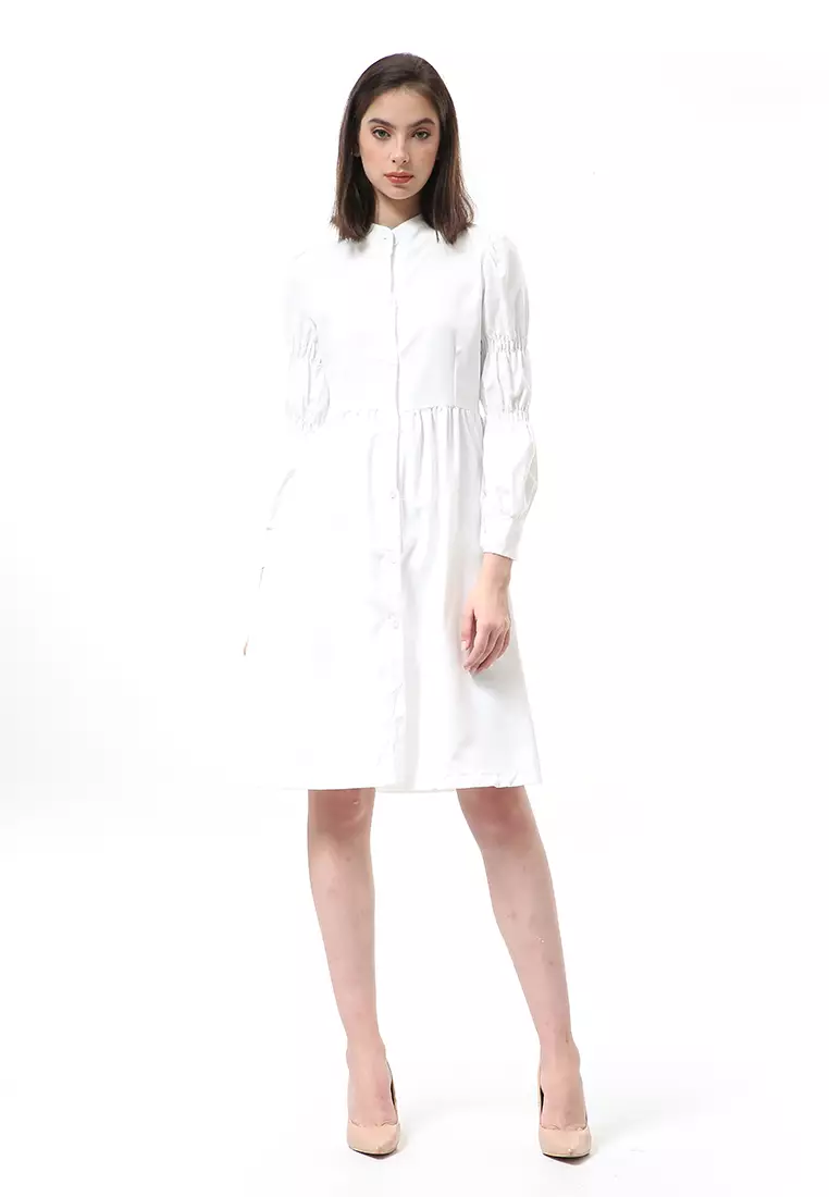 Rachel Dress Midi Kasual Wanita Full Kancing Lengan Bubble Material Cotton ORIGINAL - White