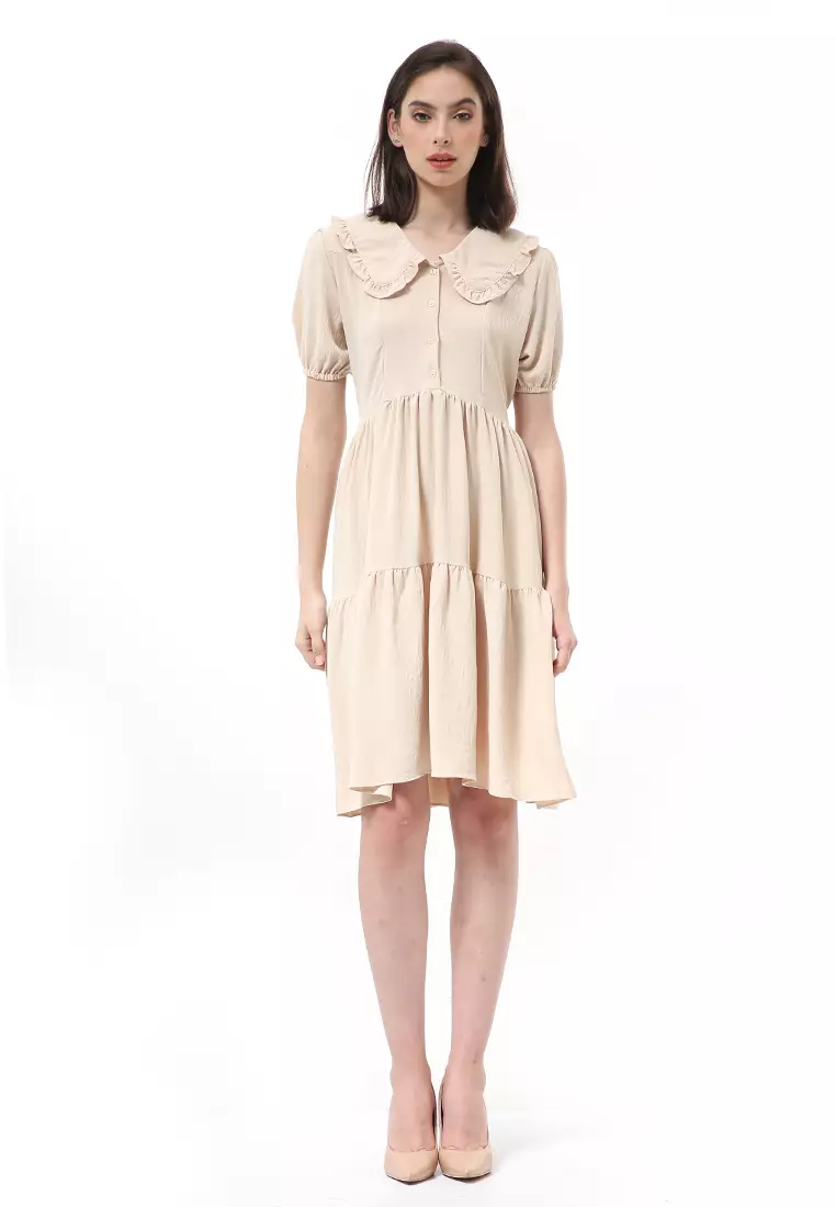 Rachel Dress Rample Wanita Collar Vintage Button Layer Trap Lengan Pendek Material Cey Flow ORIGINAL - Cream