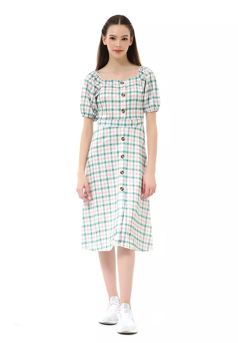 Rachel Dress Wanita Lengan Pendek Model Balon Plaid Motive Material Polyester ORIGINAL - Green