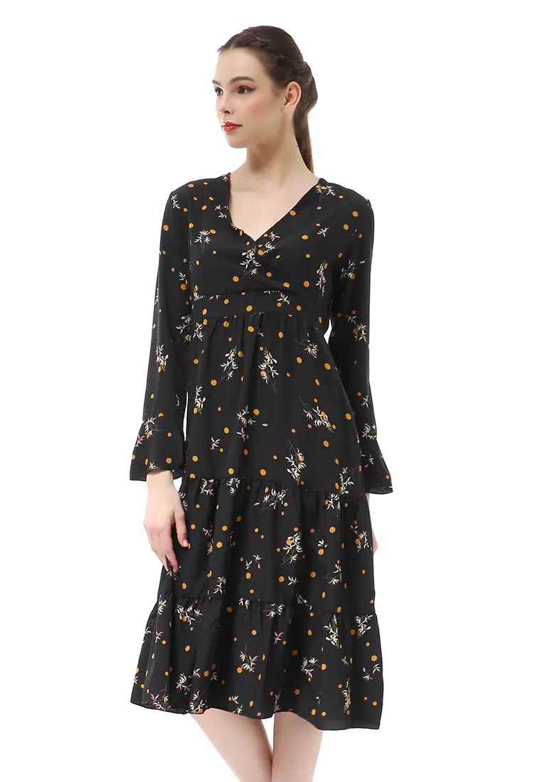 Rachel Midi Dress Kasual Wanita Long Sleeve Leaf Motve Material Chiffon ORIGINAL - Black