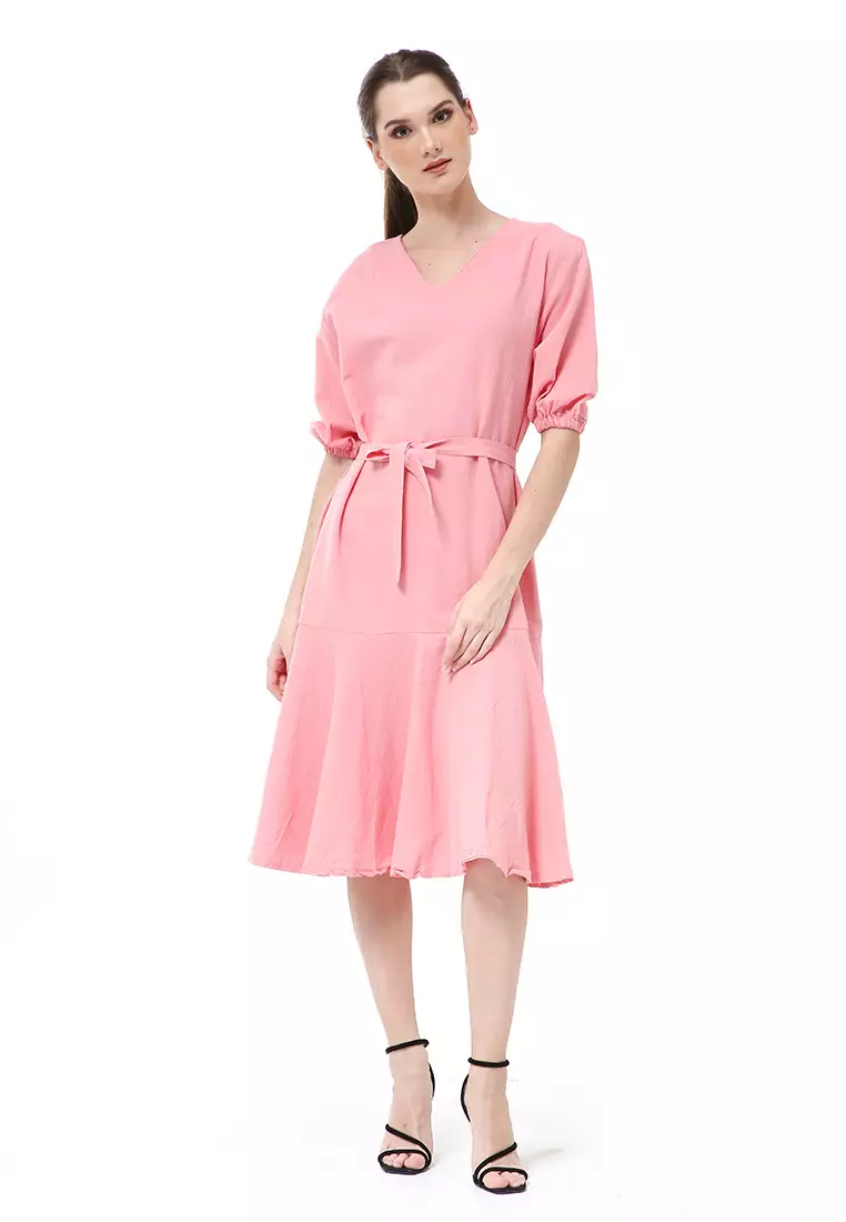 Rachel Midi Dress Ruffle Wanita with Strap Lengan Pendek Material Linen ORIGINAL - Pink