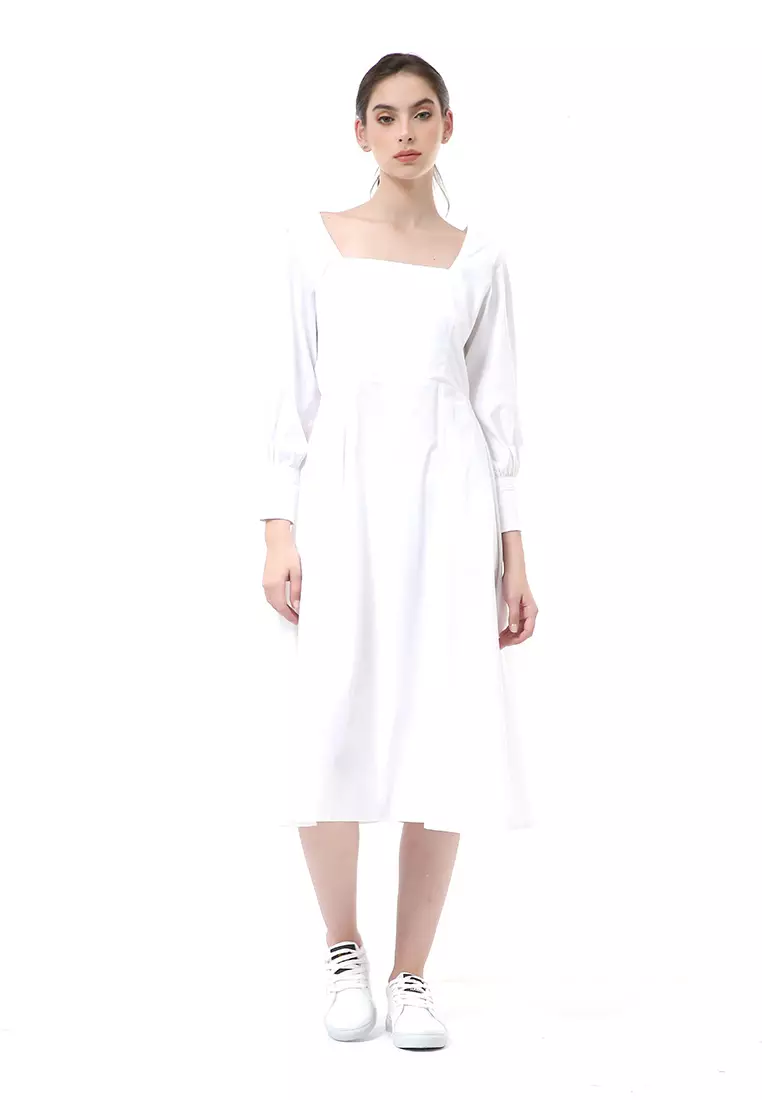 Rachel Midi Dress Wanita Leher Kotak Lengan Panjang Motif Polos Material Cotton ORIGINAL - White