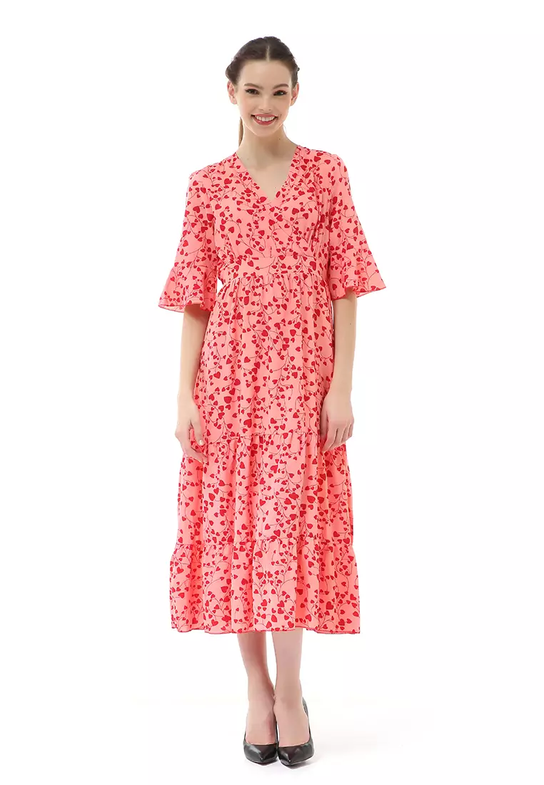 Rachel Midi Dress Wanita Vneck Lengan Pendek Desain Karet Material Polyester ORIGINAL - Pink