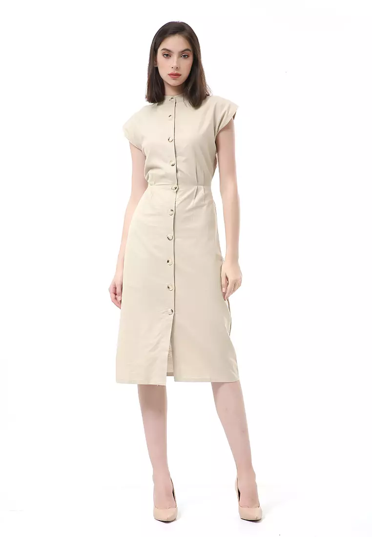 Rachel Rok Wanita Lengan Pendek Button Front Midi Dress Material Sateen ORIGINAL - Nude Brown