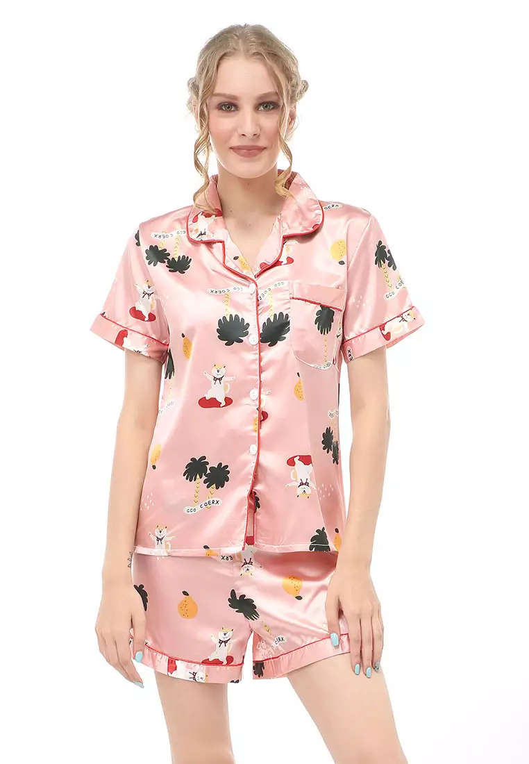 Vance Setelan Baju Tidur Wanita Lengan Pendek Motif Japancat Material Satin ORIGINAL - Pink