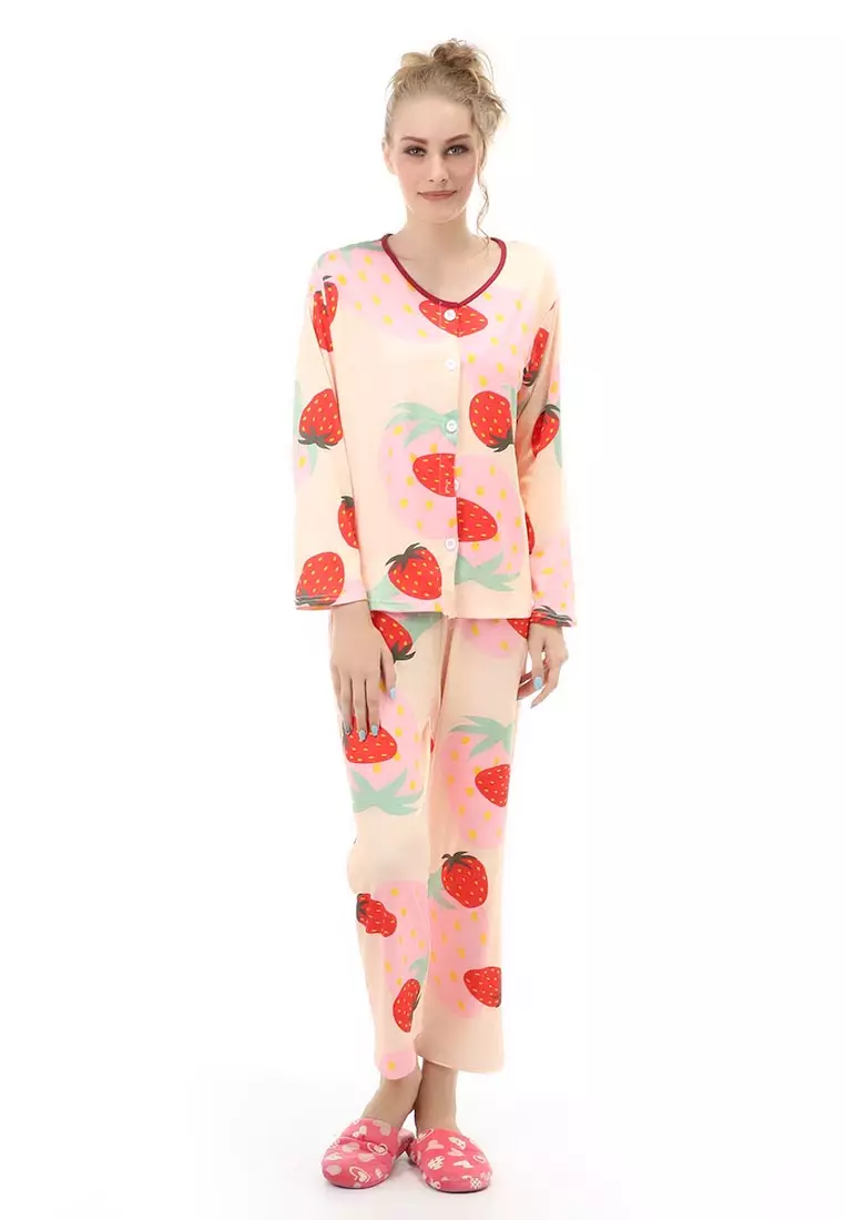 Vance Setelan Piyama Baju Tidur Wanita Lengan Panjang Strawberry Motive Material Cotton ORIGINAL - Cream