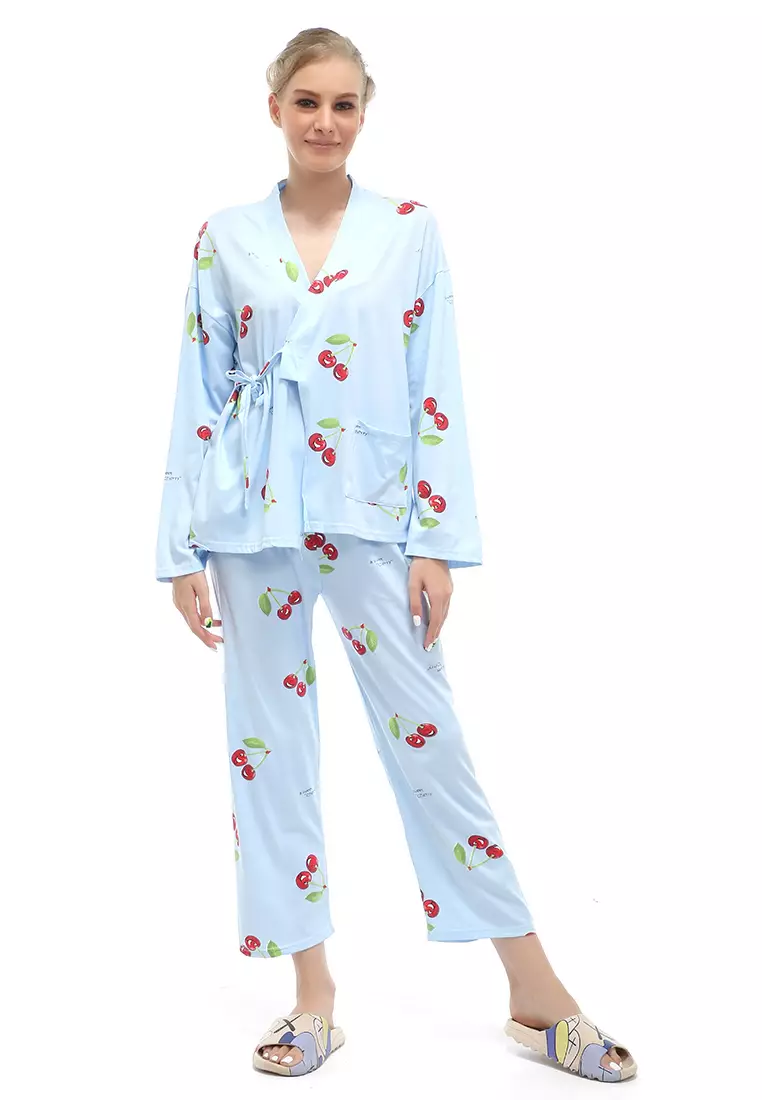 HamlinVance Setelan Piyama Kimono Baju Tidur Wanita Lengan Panjang Motif Cherry Material Cotton ORIGINAL - Blue1892500.00757000.00
