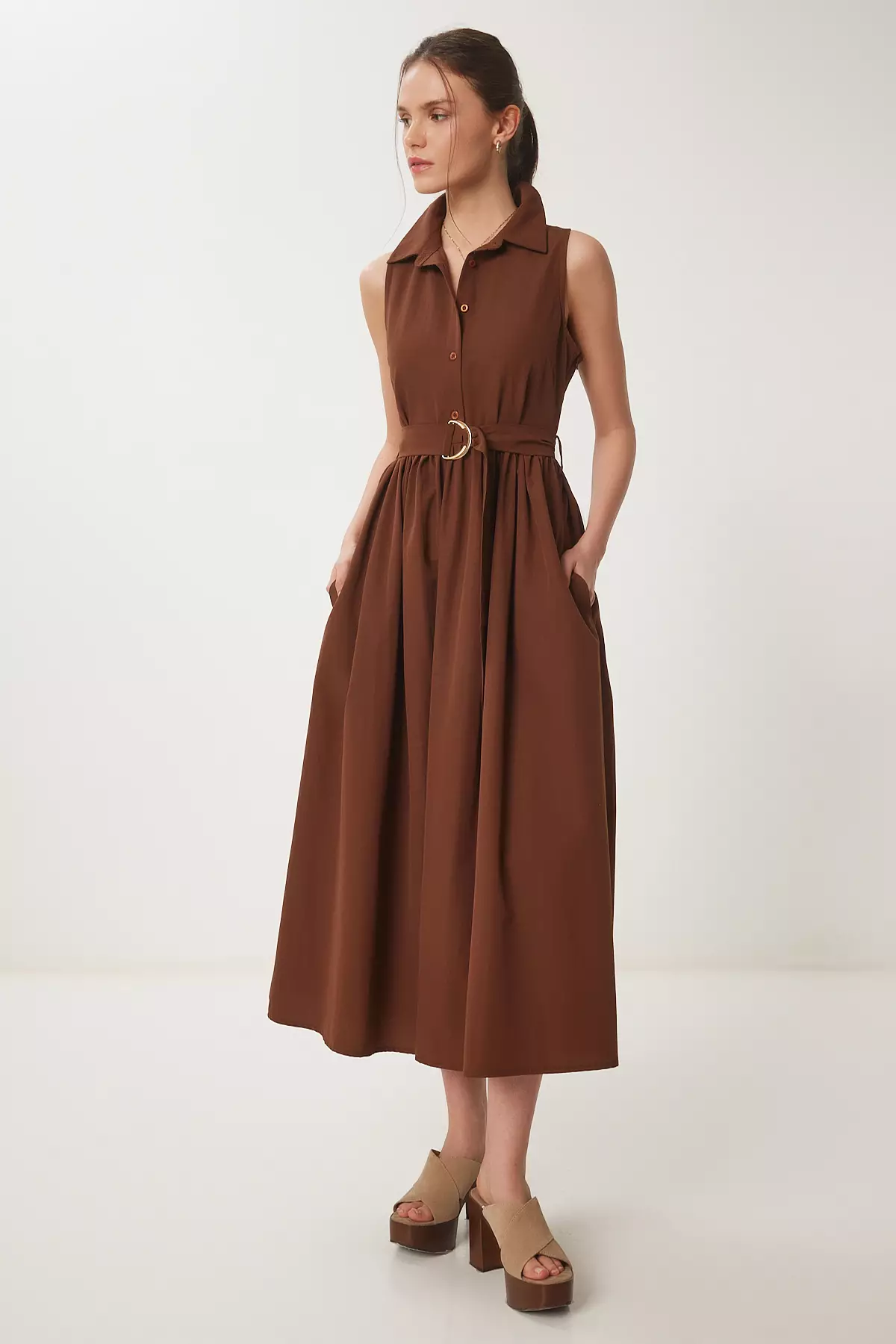 Happiness IstanbulWomen's Brown Belted Poplin Midi Shirt Dress Ub003541049000.00