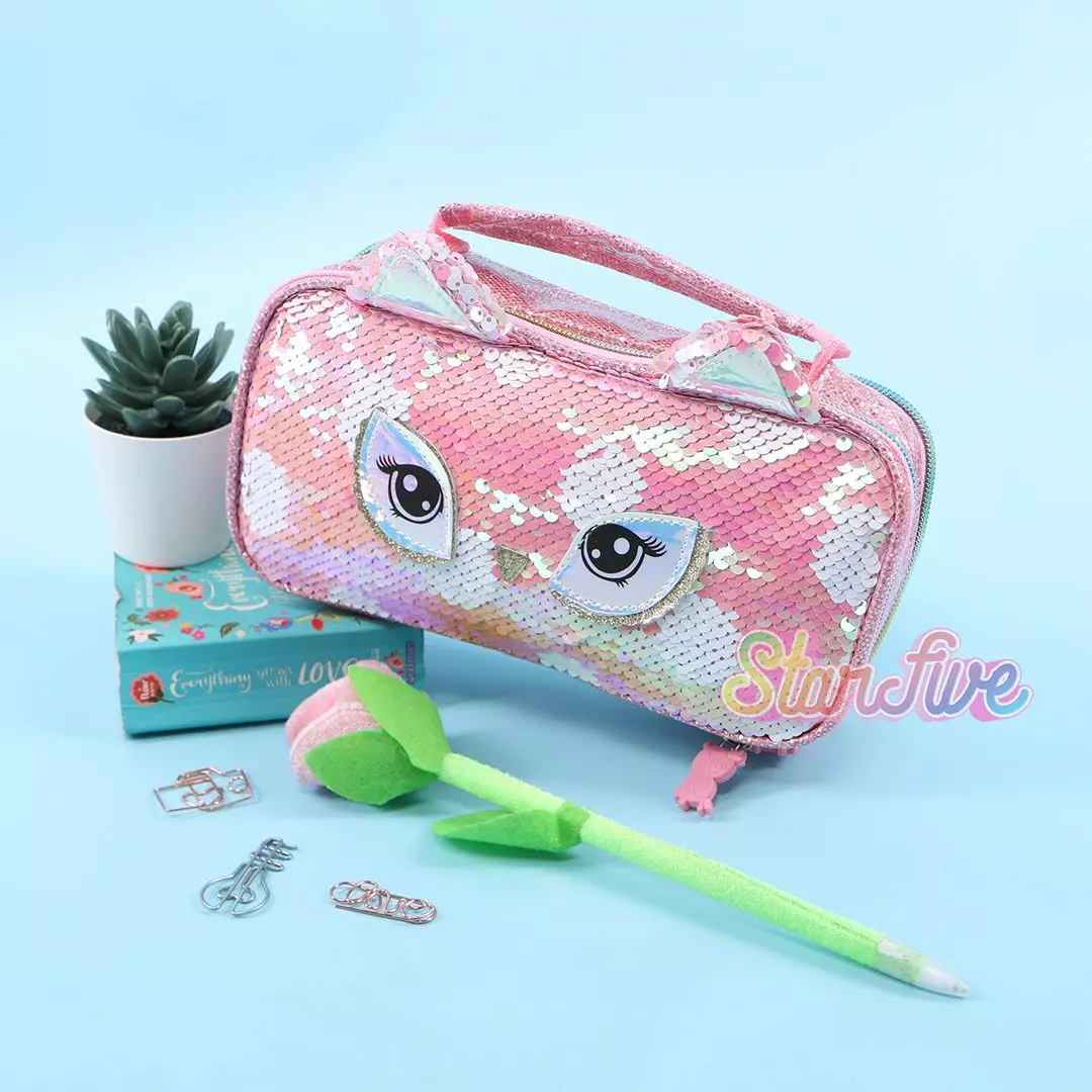 TEMPAT PENSIL JINJING CARRY ON SEQUIN KOTAK STARFIVE - OWL PINK