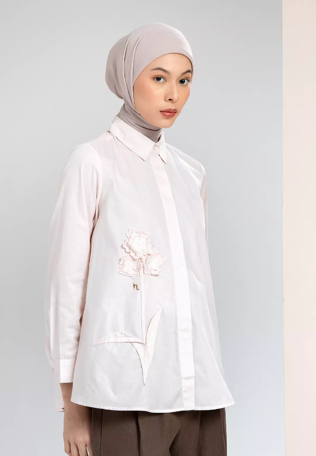 HijabChic Elarona Blush Pink Top - Atasan Kemeja Flower Bordir Tiga Dimensi Unik