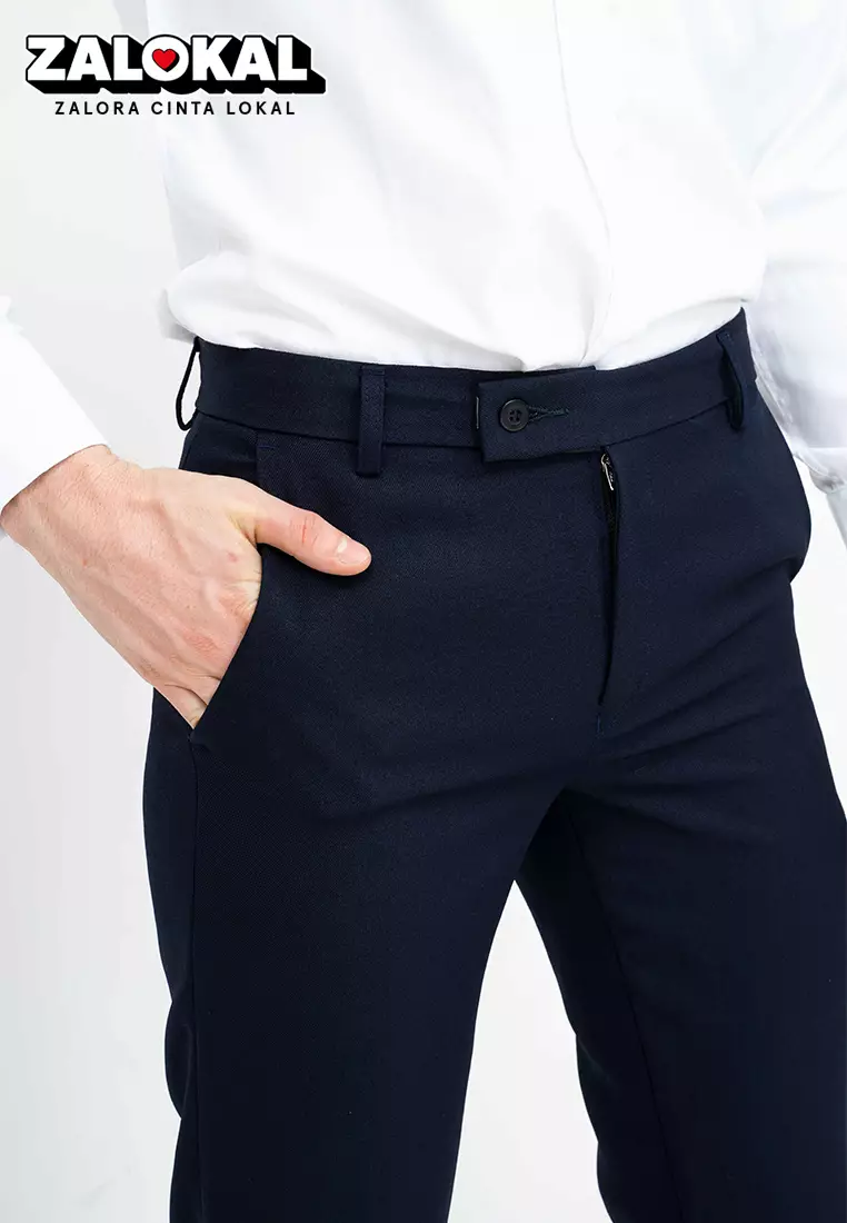 Celana panjang pria slim fit kerja formal button celana bahan stretch navy