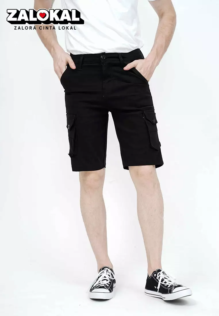 Celana pendek kargo pria cargo pants slim fit melar stretch houseofcuff Hitam