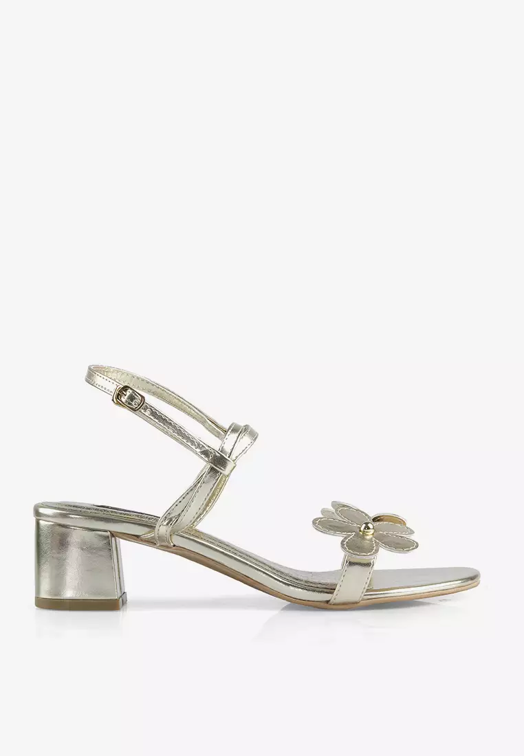 Daisy Block Heels Bunga Metalik Metallic Leather Hak Kotak High Heels Pesta