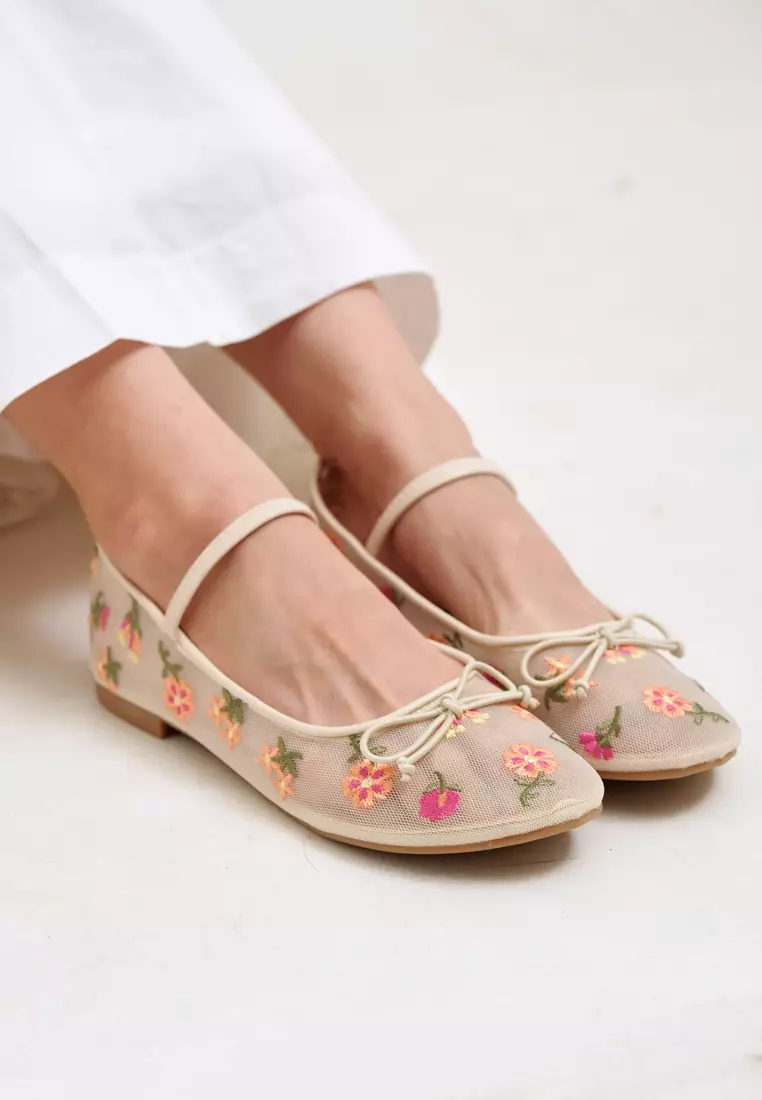 Lyla Mary Jane Mesh Flat Shoes Embroidery Ballerina Flower Cream