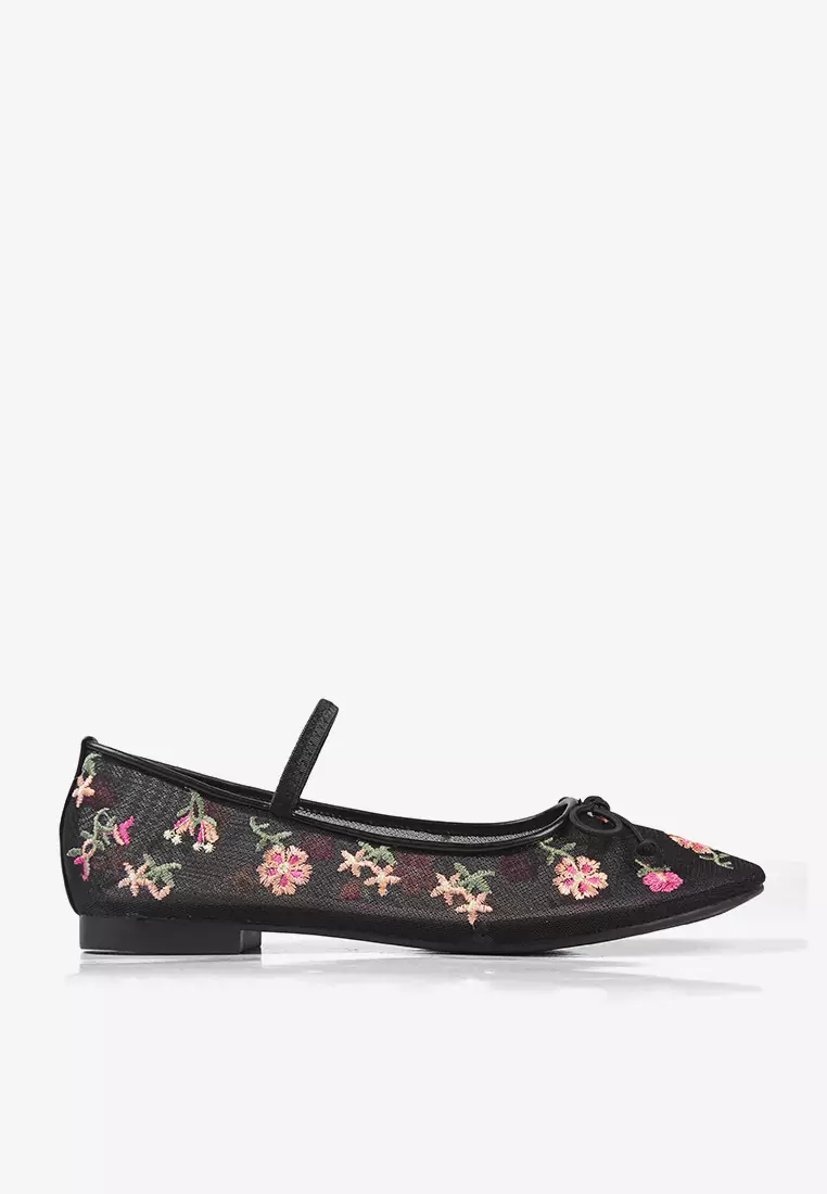 Lyla Mary Jane Mesh Flat Shoes Embroidery Flower Ballerina Black