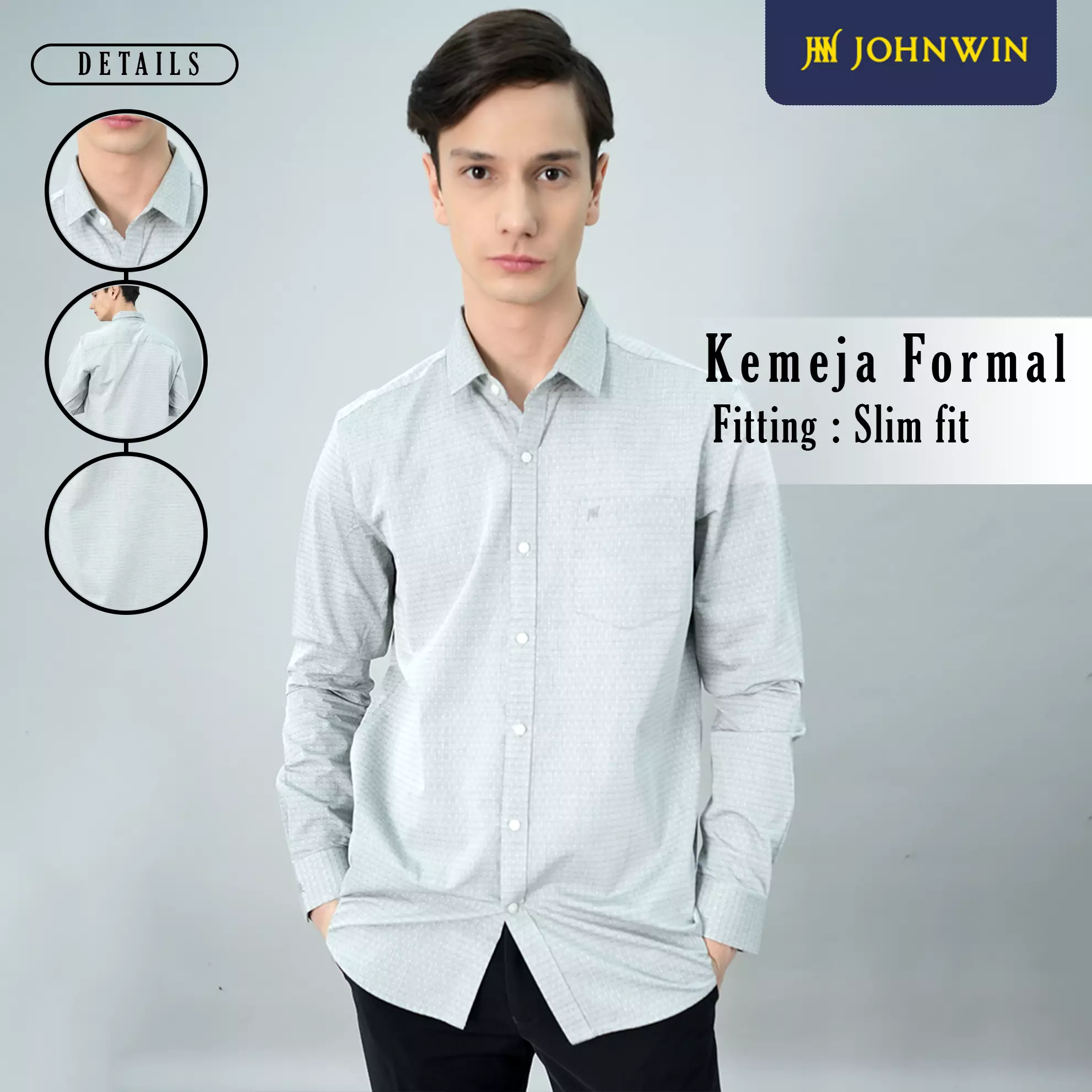 Johnwin - Kemeja Formal - Kemeja Motif - Lengan Panjang Slim Fit Putih