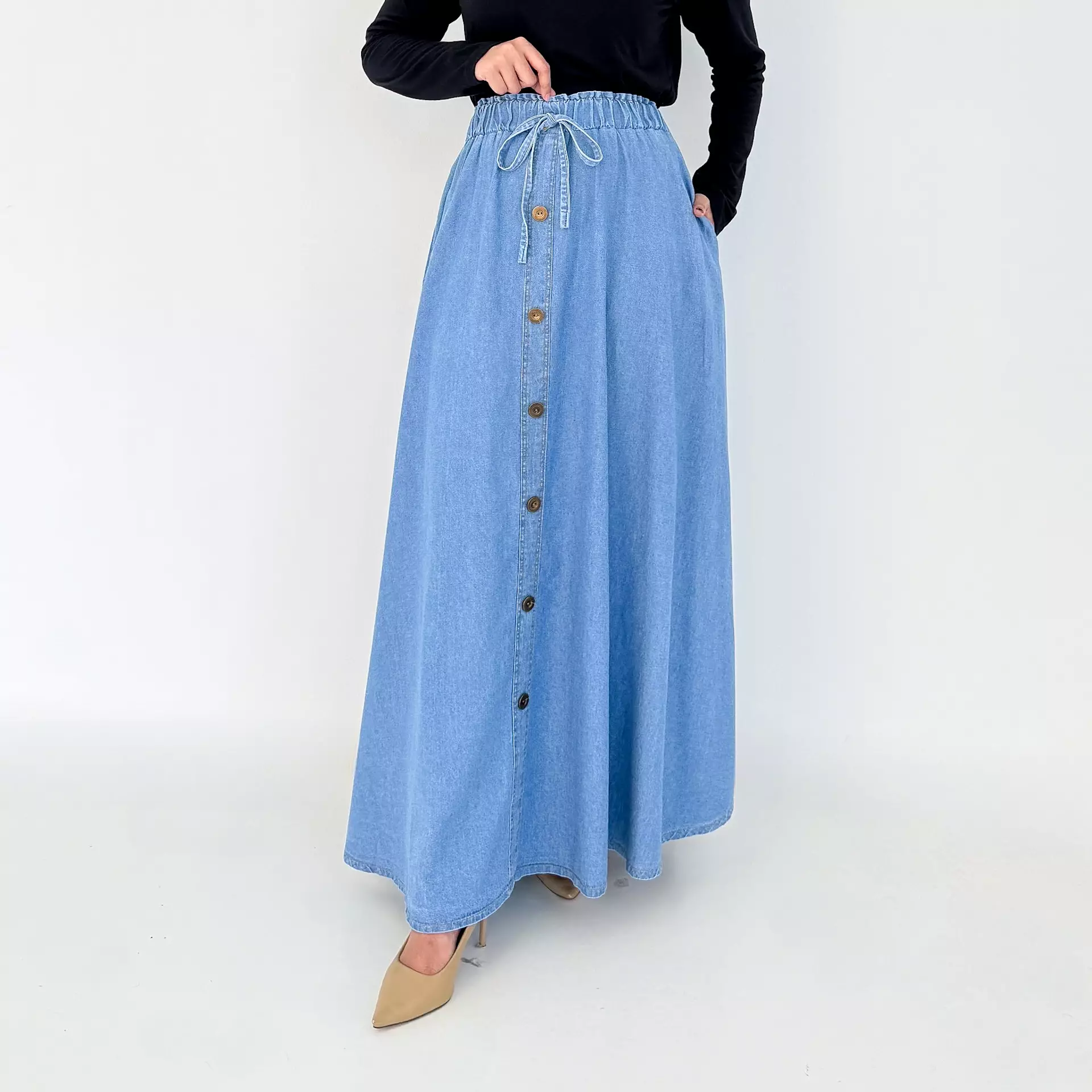 Niki Denim Flare Skirt BIRU MUDA Rok Panjang Wanita Panjang 102 cm