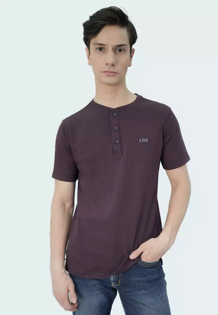 LGSLGS - Kaos Pria - Lengan Pendek - Kancing Dada - Motif Polos - Kerah Henley - Katun Premium - Bertekstur Popcorn - Merah Maroon - JPS.321.S3229F.02.C379800.00246870.00